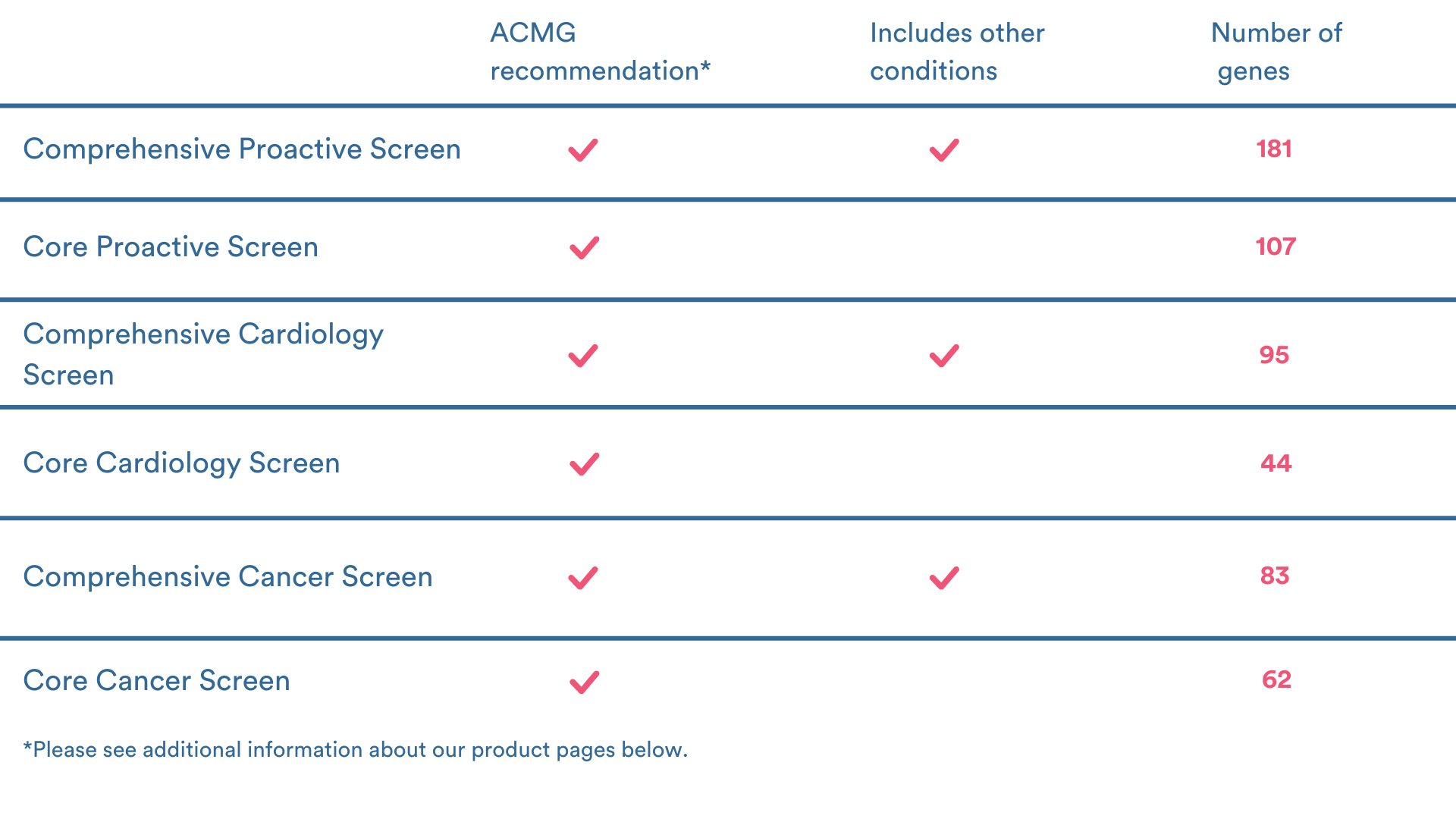 Some patients want to learn more about their health and take preventive steps to reduce the risks of developing certain diseases. A proactive screening test gives healthy individuals, without a family history, information about their chance of having a genetic condition that is medically actionable, one where preventive steps can be put in place to improve the likelihood of living a long and healthy life.