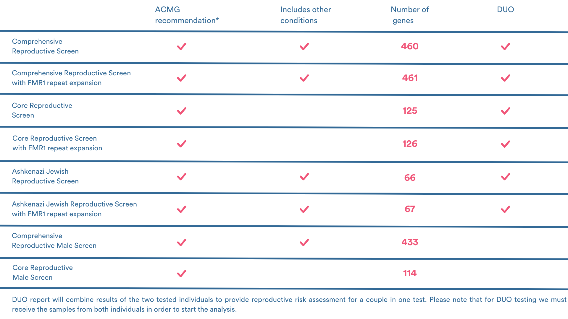 The Reproductive Screening test includes selected genes, which are associated with a number of autosomal recessive and X-linked conditions.